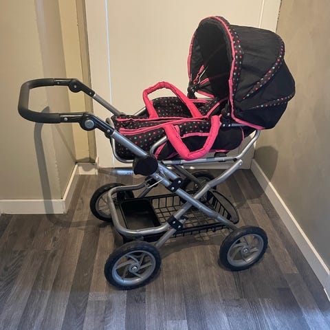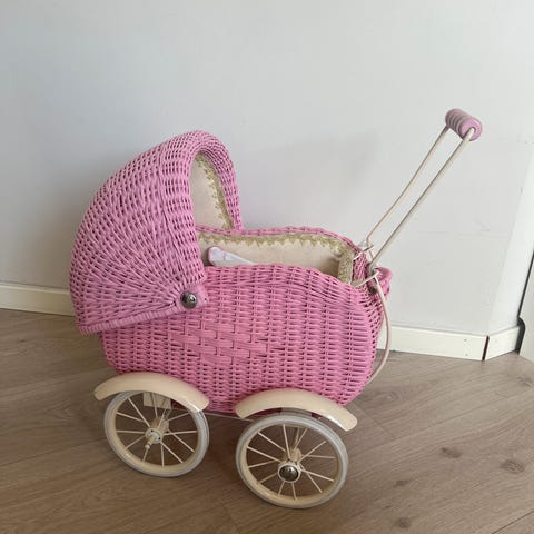 En rosa dukkevogn.