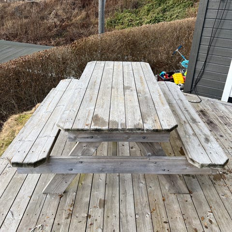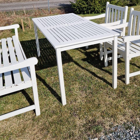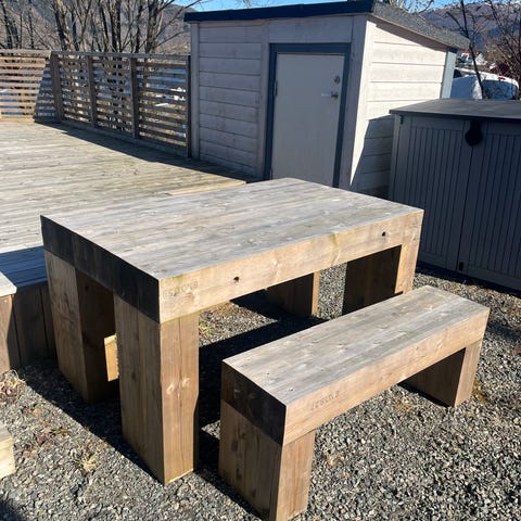 Spisebord med benk i furu, beiset svart for fem år siden. Beregnet for innebruk, men har stått ute siden vi beiset det. Synlig slitasje i overflaten.