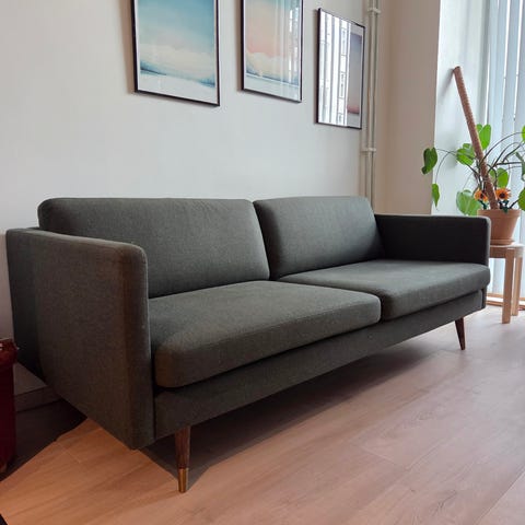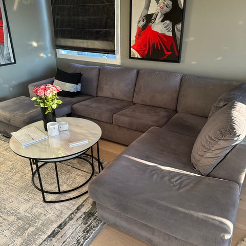 Selger vår HK Living 2 seter sofa i gyllen fløyel trekk. Ingen synlig bruksslitasje. Sofaen kostet ca 20.000 ny.