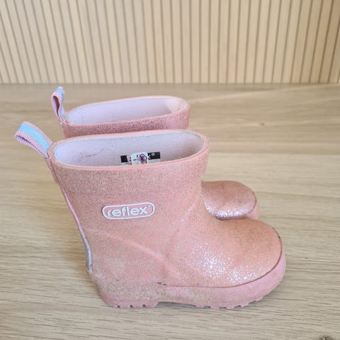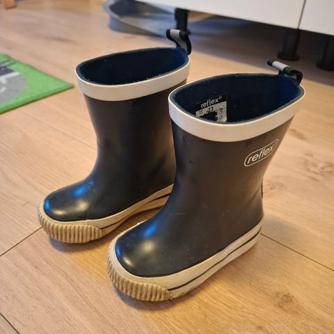 Reflex gummistøvler for barn i størrelse 23. Modellen er unisex og passer både gutter og jenter. Støvlene er i marineblå farge med lyse detaljer og har hempe bak for enklere av- og påkledning. Sålen er mønstret for bedre grep på vått underlag. Egnet som regnstøvler til bruk i barnehage, skole og fritid på regnværsdager og ellers når det er vått ute.