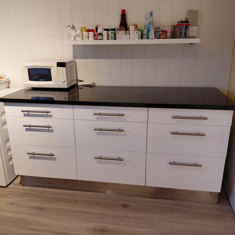 Følger også med naturstensplate bak benkeplaten som på bildet av kjøkkenet.