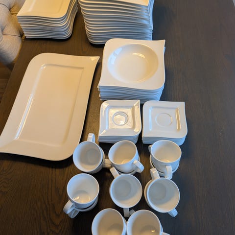 12 middagstallerker, pent brukt. Selges grunnet plassmangel
