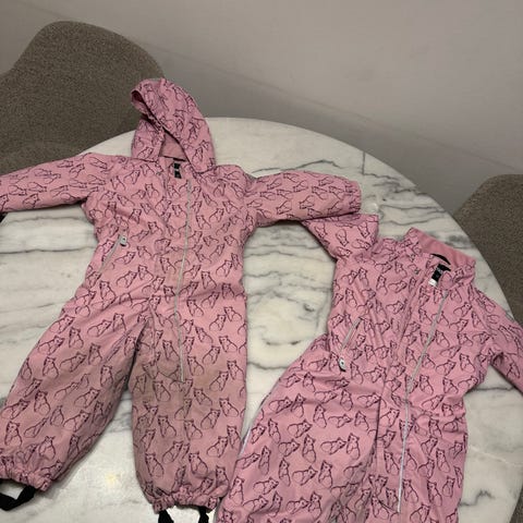 Reima kjeledress for jente i størrelse 92. Dressen er rosa med mønster og har hette med avtagbar eller fast pelskant (imitasjon). Glidelås foran gjør den enkel å ta av og på. Egnet som yttertøy for barn i barnehage- og utelekalder.