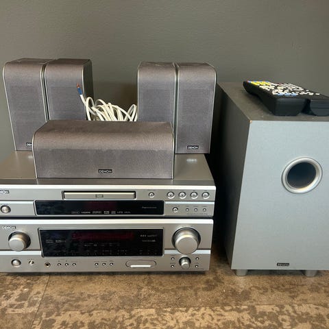Yamaha stereoanlegg med forsterker, to kompakte høyttalere og subwoofer.