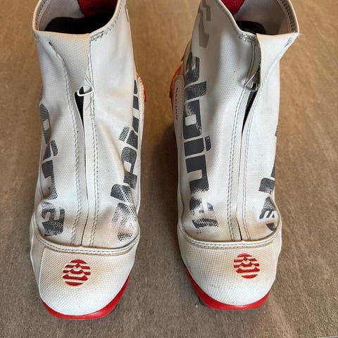 Alpina Pro Classic langrennssko i rød og svart farge. Skoene har overtrekkslignende yttermateriale med glidelås foran som dekker lissesystemet. Hælkappen er forsterket. Kun brukt på snø ikke på rulleski, alltid brukt med boot cover så sålen er helt strøken.