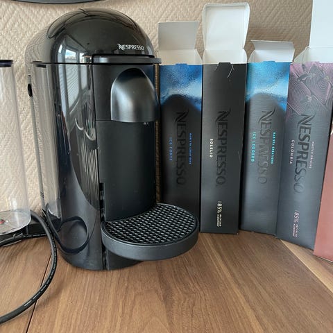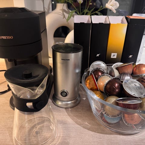 Selger en flott Nespresso Vertuo Next kaffemaskin i sort utførelse.Dette følger med Aeroccino melkeskummer .