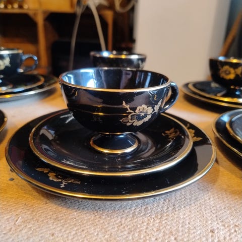 Stavangerflint kaffekopper med skål og asjett i svart glasert porselen/keramikk med hvit blomstermotiv og gullkant.