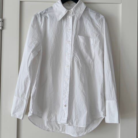 Filippa K skjorte for dame i størrelse S. Klassisk hvit skjorte i bomull med krage, knappelukking foran og brystlomme. Enkel og tidløs modell som passer til både hverdags- og kontorantrekk.