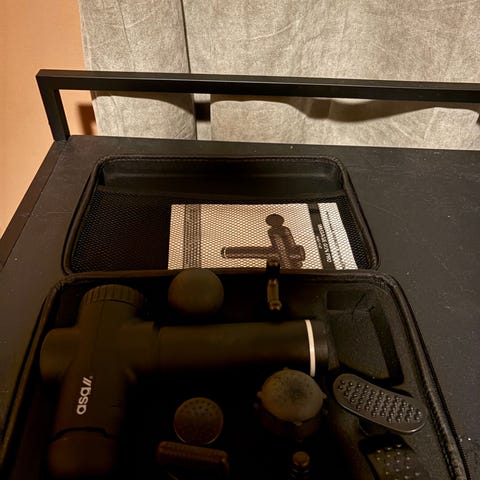 Massasjepistol i svart farge med flere utskiftbare hoder for ulike muskelgrupper. Leveres i etui med formtilpassede rom for pistol og tilbehør, samt nettinglomme for oppbevaring av ladekabel og smådeler. Egnet til punktmassasje og generell muskelbehandling hjemme eller på trening.