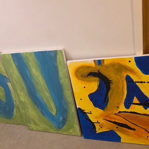 Innrammede kunsttrykk med motiv av mennesker og landskap. Bildene er montert med passepartout i rektangulære, gullfargede rammer. Egner seg som veggdekor i stue, gang eller andre oppholdsrom. Kan henges samlet som en serie eller brukes enkeltvis.