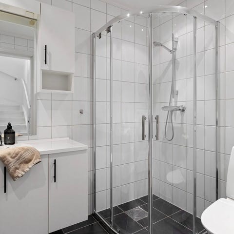 Baderomsinnredning med dusjvegg, toalett og servantskap