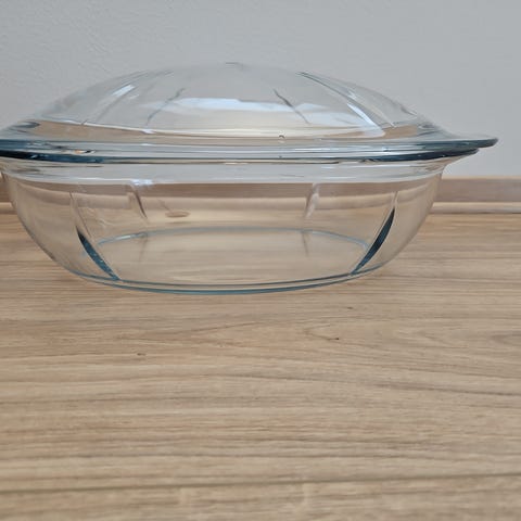 Ildfastform i glass med lokk fra franske ARC. Selve formen uten lokk måler 22cm i diameter uten håndtak og 10cm i høyde. Høyde med lokk