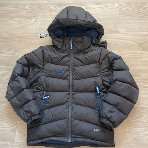 Reima dunjakke for gutt i størrelse 164. Jakken er blå med mørkere felter og har hette. Fylt med dun for god isolasjon.