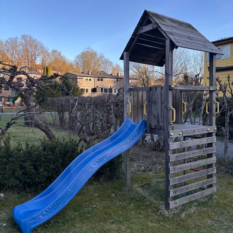 Her kan barna klatre, huske, skli, leke i sandkassen og bruke fantasien i timevis — en privat lekeplass rett utenfor døren.