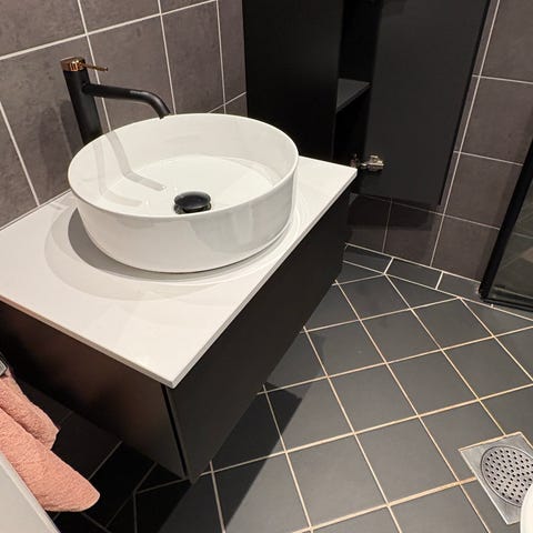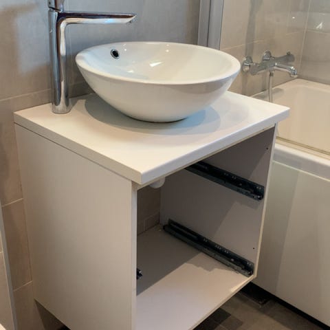Det er ikke tatt hull i benkeplaten for armatur og avløp fra vasken.