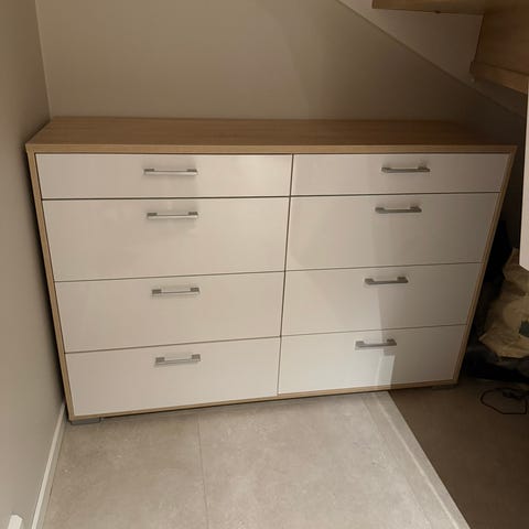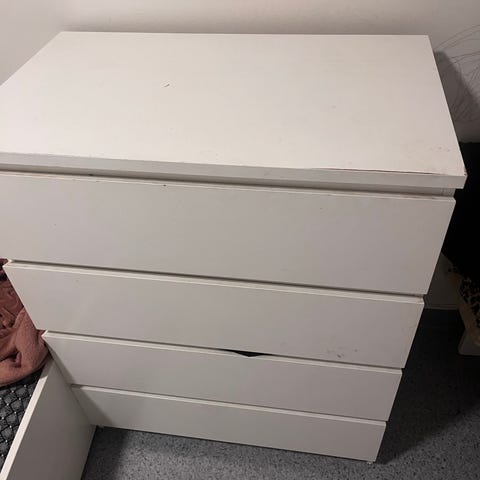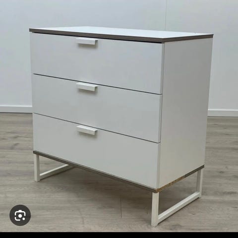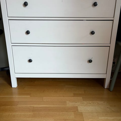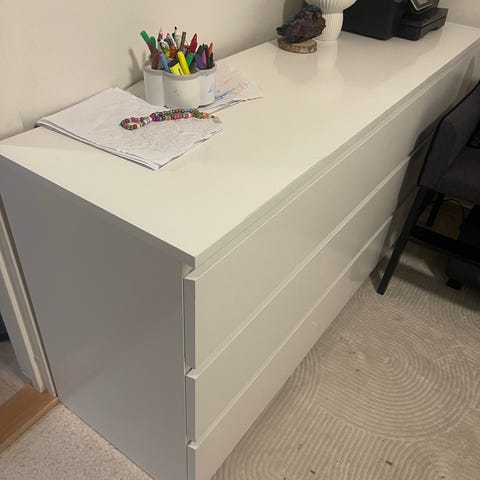 2st IKEA Trysil kommode i hvit utførelse med flere romslige skuffer. Kommoden står på ben, noe som gir enkel tilgang for rengjøring under. Passer til oppbevaring av klær, tekstiler eller andre gjenstander på soverom, gang eller stue. Nøytral farge gjør at møbelet enkelt kan kombineres med annet interiør.