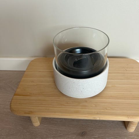 bordpeis med glass og metall. Dekorativ liten peis beregnet for plassering på bord eller annen stabil overflate innendørs eller på skjermet uteplass. Består av en rektangulær base i mørk utførelse med metallinnsats for flammen i midten, og to glassplater på sidene som fungerer som skjerming. Egnet som stemningslys og dekorasjon. Litt Etanol medfølger