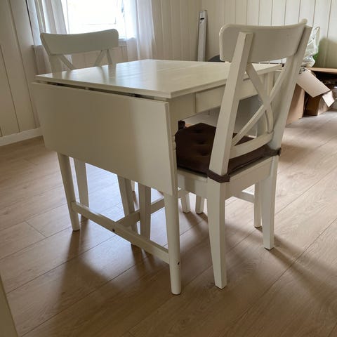 Pent kjøkkenbord med to klaffer . Stoler og puter følger med.