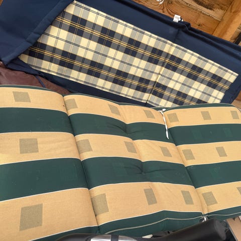 Hageputer til solseng og stol i ulike mønstre og farger. Putene har hovedsakelig rutete mønster i blått, gult og hvitt, samt noen med stripete flerfarget mønster. De er polstrede og beregnet for bruk utendørs på solsenger eller hagestoler. Putene har stropper eller bånd for feste til møbelet og håndtak for enkel bæring. Egner seg til hagemøbler på terrasse, balkong eller i hage.