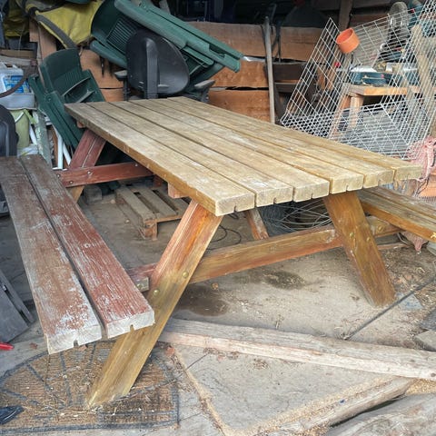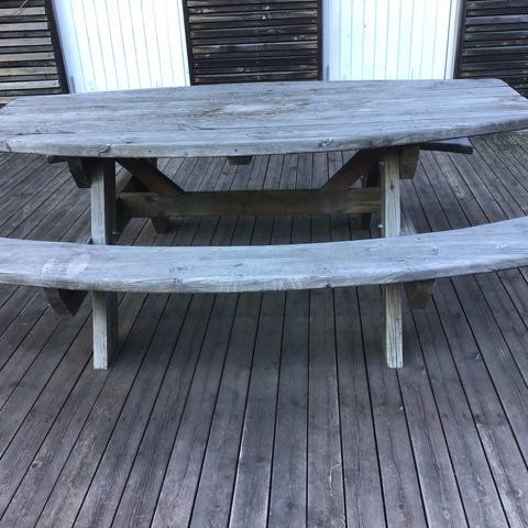 Piknikbord i solid tre med benker. Benkene kan vippes opp og ned (se bilder).