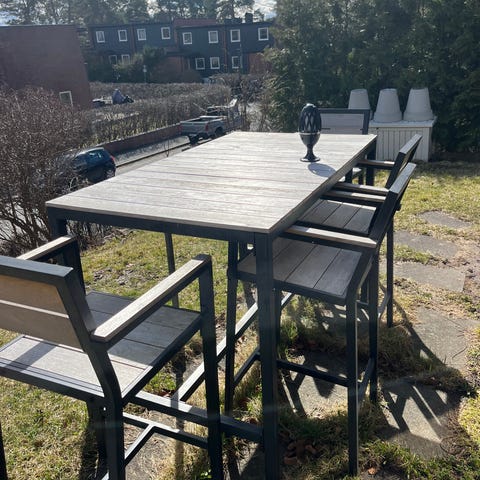 2 år gammelt bord og stoler. Kjøpt på Plantasjen. Lite brukt, men litt slitasje på bordet som har stått ute en vinter. Høyde 101 cm, bredde 85 cm og lengde 150 cm.