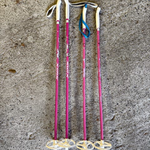 Skistavene er fra Powah, i blå 100cm, og grå Fisher, med lengde 110 cm. Stavene har håndstropp og tradisjonell trinse for bruk i preparerte løyper.