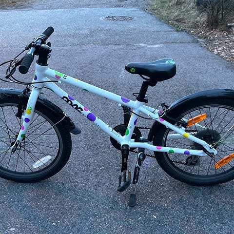 Frog 48 barnesykkel med 16" hjul. Sykkelen har hvit ramme med flerfargede prikker og rette styre med håndbremser. Utstyrt med skjermer foran og bak, kjedebeskyttelse og støtte. Egner seg for barn som passer til 16" hjulstørrelse, til bruk på vei og lett grus. Litt slitt her og der, men det har ingenting å si for bruken.