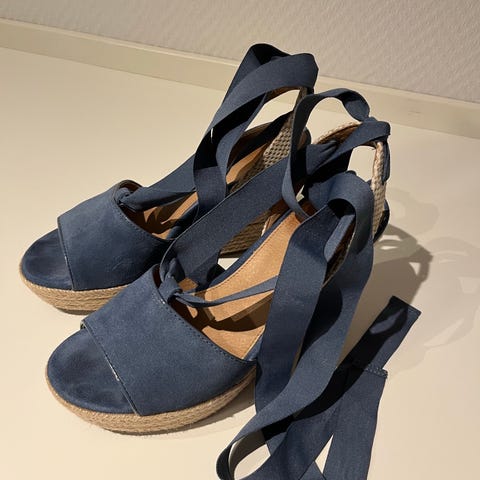 Kjempefine UGG sandaler i størrelse 39. Sandalene har blå denim overdel med åpen tå og ankelreim som knytes rundt ankelen. Skoen er god å gå i, med flettet yttersåle og kilehæl. Innvendig såle er i glatt materiale med perforerte detaljer under foten for komfort.