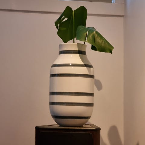 Kähler vase i keramikk med hvit glasur og horisontale metalliske striper. Vasen har rund form med smalere åpning øverst, egnet til snittblomster, tørkede blomster eller som dekorobjekt. Passer godt på bord, hylle eller vinduskarm i ulike rom i hjemmet.