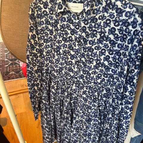Marineblå skjortekjole fra Norett i 100%Bomull. Nydelige detaljer som: stofftrukket knapper fra halsen, hele veien ned. Tre knapper på hver side av håndledd. Midjebelte. Stikklommer. Har i str 36 og 40. Perfekt til 17.mai eller sommeren. Kjolen selges fra DÉSIRÉE interiør I Arendal. Kan sende mot at kjøper betaler frakt. Pruting besvares IKKE.