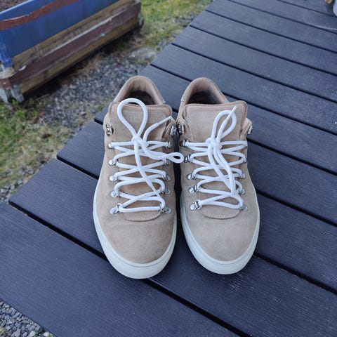 Diemme sneakers joggesko i størrelse 37. Skoene er i beige semsket skinn med lisser og metallhemper. Modellen har gummisåle og er egnet til hverdagsbruk. Nøytral farge som passer til mye forskjellig tøy.