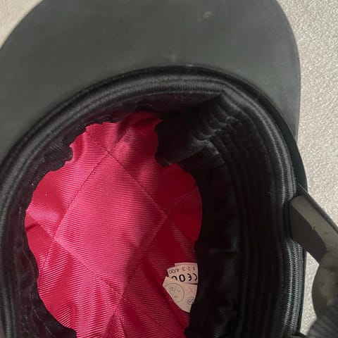 RS Ryttersport ridehjelm i størrelse 57. Hjelmen er svart med lys ventilasjonsdetalj i front. Justerbar hakereim. Egnet som ridehjelm til hestesport og ridning. Materiale er tekstiltrukket ytterskall med polstret innside for økt komfort.