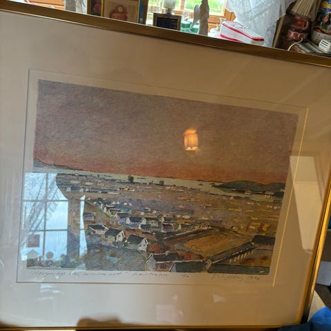 Motiv med landskap, åser, vann, hus og sauer. Bildet er signert «Ferdinand Finne» og datert «-88» nede til høyre, og nummerert 9/65 nede til venstre. Det står «akvatint, 5 plater» som angivelse av teknikk. Grafikken er innrammet med passepartout og ramme i metallfarge (gullfarget). Egnet som veggbilde i stue, gang eller andre oppholdsrom.