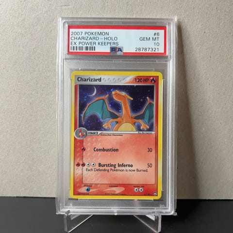 Selger et gradert Charizard fra Pokémon Base Set (1999).