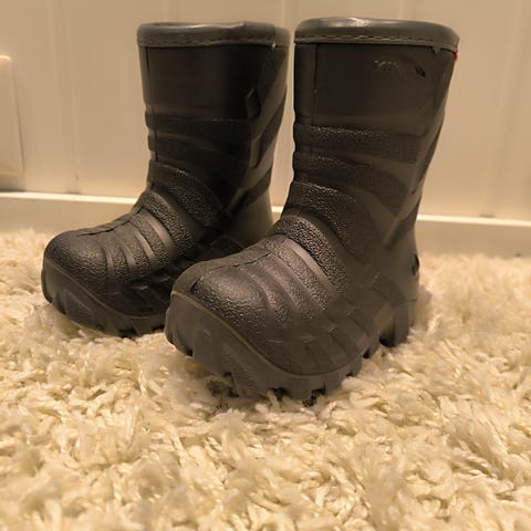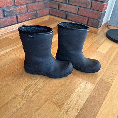 Skoene er svarte og har grov såle for godt grep. Overdelen er i et vannavvisende materiale med snøring/stramming øverst for bedre passform rundt leggen. Fóret innvendig.