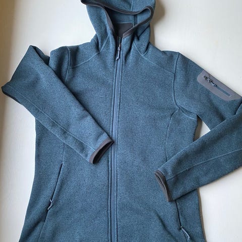 Bergans fleecejakke i unisex størrelse M. Jakken er grønnmelert med hette og hel glidelås i front. Den har sidelommer med glidelås og brodert Bergans-logo på brystet. Myk innside i fleece gir isolasjon og komfort. Egnet som mellomlag eller ytterlag ved fottur og annen friluftsbruk i kjølig vær.
