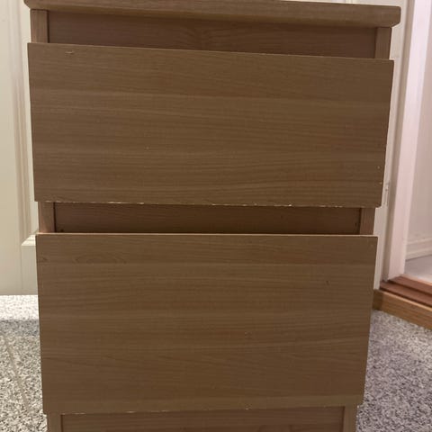 Malm nattbord i tre selges. Har noen bruksmerker. Er trefarget, ikke hvitbeiset.