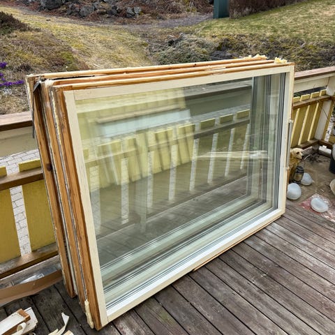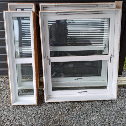 Vinduer med smal, rektangulær utforming og hvit ramme. Brukt. 1 stk -200 kr.