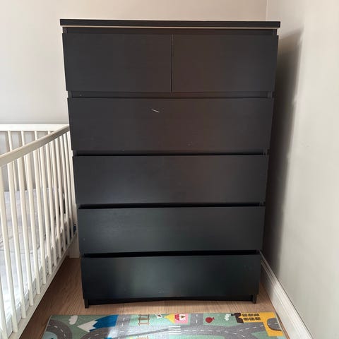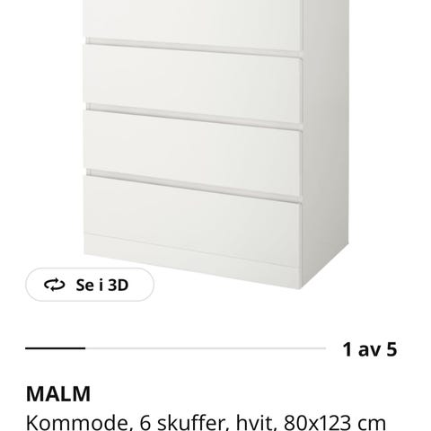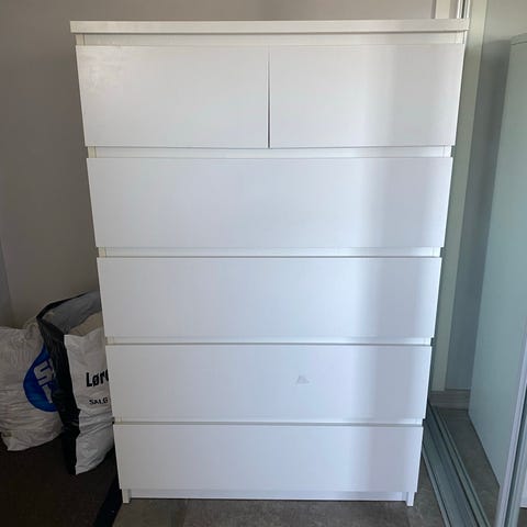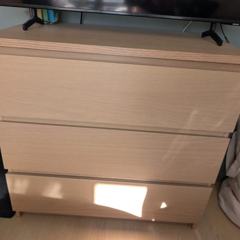Malm kommode gis bort. Bredde 80 cm dybde 48 cm høyde 123 cm. Alle skuffene kan brukes bare mangler bare 2 små planker i midten. Den er demontert. Ny koster denne 2000 kroner.