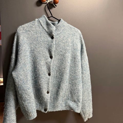 Gestuz AlphaGZ cardigan for dame i størrelse S. Cardiganen er i blå ullkvalitet med knappelukking foran. Kun brukt noen få ganger.