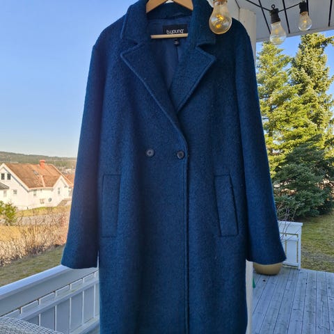 Selger en kåpe fra Lindex i størrelse M. Lang, mørk blå ullkåpe med krage og knapping foran. Kåpen har to store frontlommer og helfôret innside.