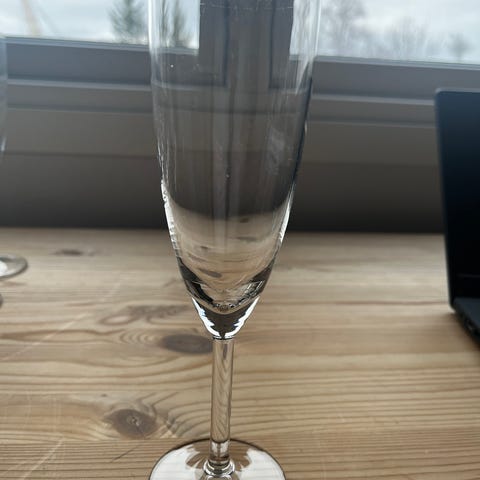 Inntil 35 champagneglass selges. Brukt kun 1 gang. Høyde ca. 19 cm, diameter oppe ca. 5 cm. Pris pr. stykk kr 15,-.