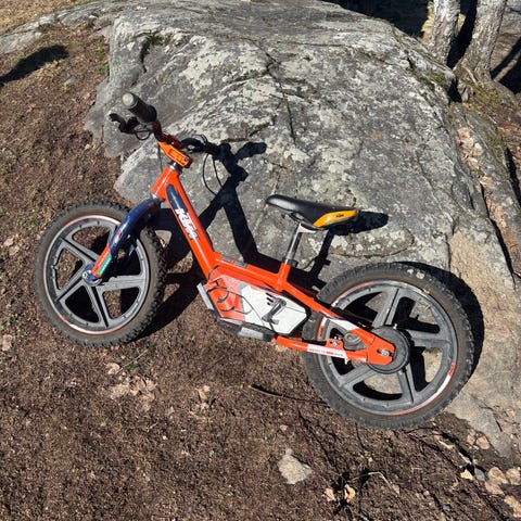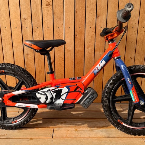 KTM elektrisk barnesykkel med 16" hjul. Modellen har elektrisk drift med batteri, og det følger med batteri og tilbehør som vist på bildene. Perfekt for barn mellom 4-8år. Gi barna en mulighet til å trene balanse på en elektrisk balanse-sykkel med brems og gasshåndtak. Du som foresatt styrer enkelt effekten etter barnets ferdigheter. Selges med nye batteri og bakk dekk, sykkel er som nyt.