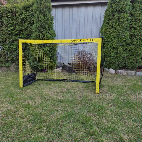 Fotballmål med nett i svart og hvitt. Målet har ramme i rørkonstruksjon og er egnet til bruk i hage eller oppkjørsel for uorganisert spill og trening. Passer til barn og unge som ønsker et enkelt mål til fotballlek.