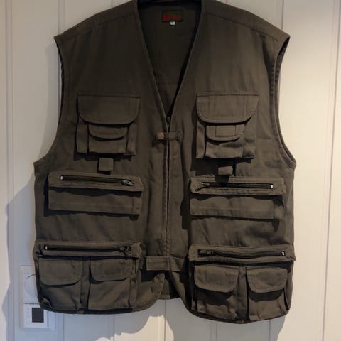 Flerlomme vest i brun og svart farge. Vesten har flere glidelås- og klaffelommer i ulike størrelser på både bryst og mage, samt hemper og festepunkter på fronten. Egnet for aktiviteter der det er behov for å ha utstyr lett tilgjengelig, for eksempel friluftsliv, fiske eller foto.
