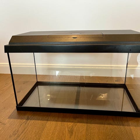 Akvarium med lokk, filter, varmeelement og dekor
