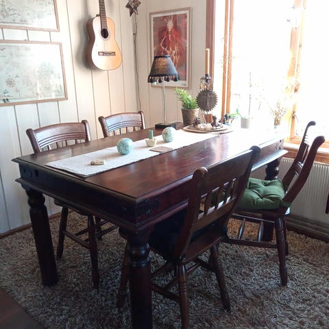 Stort spisebord med 2 plater å 8 stola.