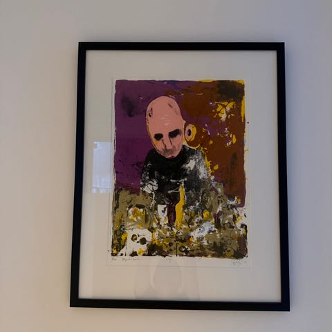 Kunstverk av den norske grafikeren Ståle Blæsterdalen (født 1951). Verket er et tresnitt, en grafisk teknikk der motivet skjæres ut i en treplate før det svertes og trykkes på papir. Trykk nr 3/100. Innrammet.