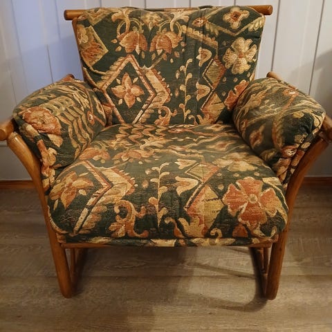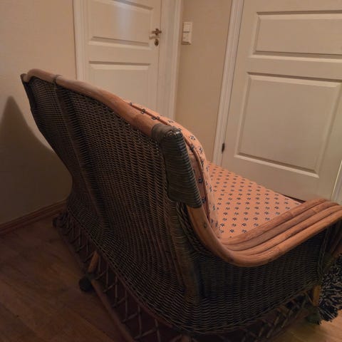 Lette og stilige godstoler i flettet bambus søker nytt hjem.
