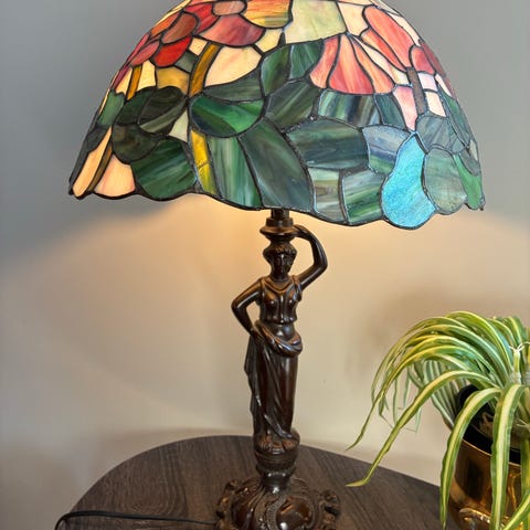 Tiffany bordlampe i flerfarget glass. Lampen er formet som en påfugl med skjerm og kropp i mosaikklignende glassbiter i ulike farger. Gir et varmt og dekorativt lys gjennom glasset. Egnet som stemningsbelysning på bord, hylle eller nattbord i stue, soverom eller gang. Bruker lyspære med vanlig sokkel (se sokkeltype på armaturen).